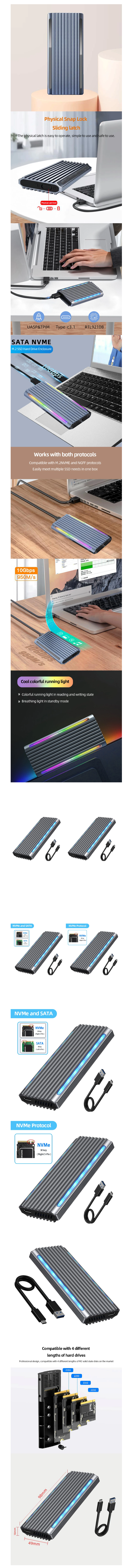 Boîtier SSD M.2 NVMe en alliage d’aluminium, RVB Type-C, USB 3.1, 10Gbps, 6Gbps, SATA, PCIe, M-Key pour M2 NVME/NGFF, boîtier de refroidissement.