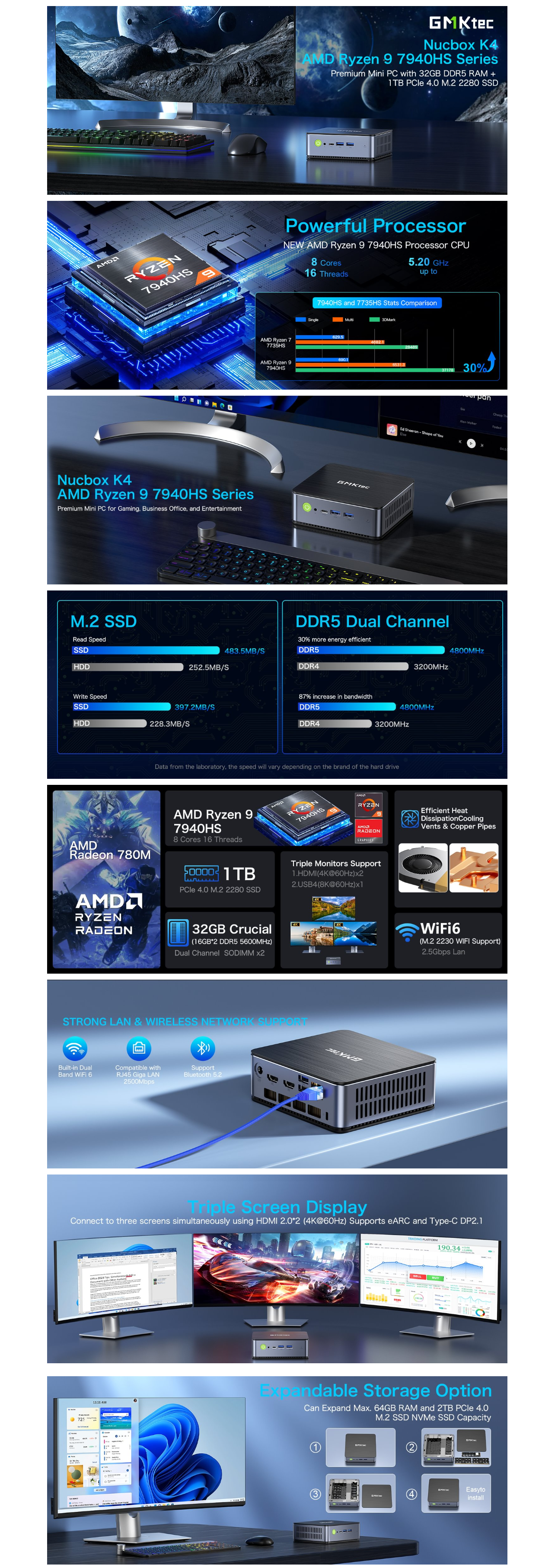 Processeurs mobiles AMD Ryzenâ„¢ 9 7940HS avec carte graphique Radeonâ„¢ 8C/16T, 4 nm, horloge 4,0G, MAX 5,2G ; 512 Mo de cache L1/8 Mo L2/16 Mo de cache L3, TDP 35 ~ 54 W | AMD Radeonâ„¢ 780M, fréquence graphique 12 cÅ“urs 2800 MHz, architecture graphique AMD RDNA 3 | 32 Go expédiés, SO-DIMM*2, DDR5 5600, max 64 Go| 1 To expédié, PCIe 4.0 M.2 2280, max 2 To (prend en charge PCIe 4.0) | Windows 11 Pro (installé), prend en charge Linux | BT 5.2/WiFi 6 RZ608 | 3 écrans : HDMI 2.0*2 (4096 x 2160 à 60 Hz) / type-c*1 USB4.0, jusqu’à 40 Gbit/s, prend en charge la fonction USB PD+DP1.4 | USB-A 3.2 (Gen2*1 10 Gbit/s) *3/ USB2.0*1/ HDMI 2.0 (4K à 60 Hz)*2/ 1* Type-C complet