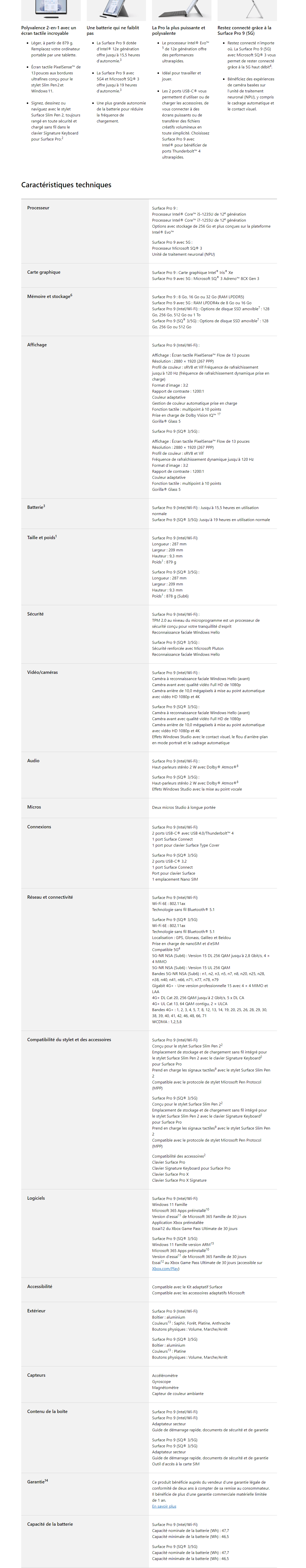 • Écran : Écran PixelSense de 13,5 pouces avec une résolution de 2880 x 1800, un rapport hauteur/largeur de 3:2, un écran tactile, antireflet et une luminosité de 1 000 nits