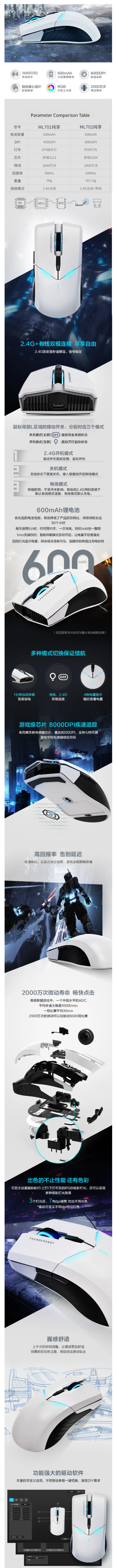 ThundeRobot ML702 Souris gaming 8000DPI sans fils 2.4G avec effet d’éclairage coloré RGB, souris de bureau Gaming Esports .