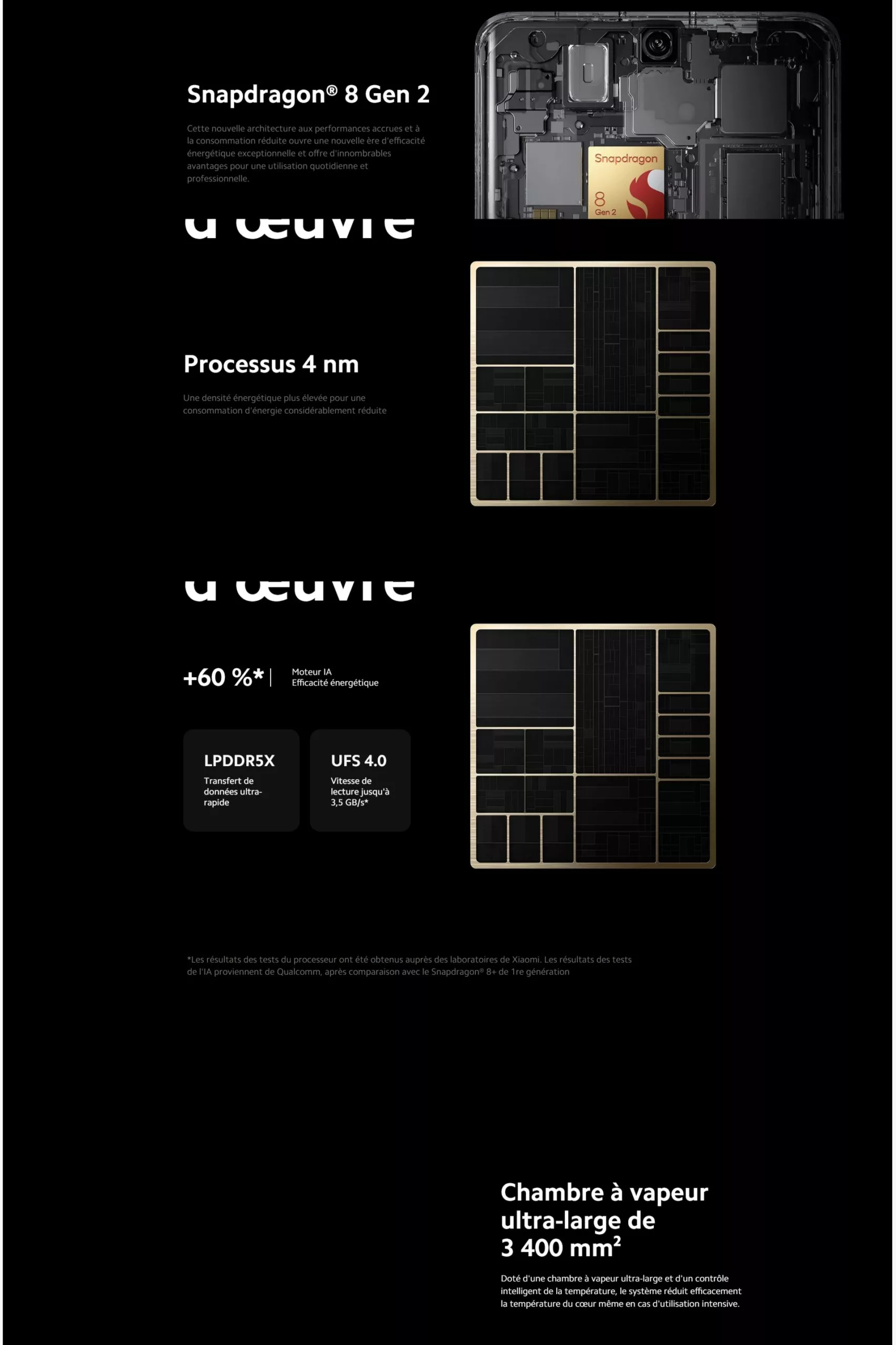 Processeur : Qualcomm SM8550-AB Snapdragon 8 Gen 2 (4 nm) | Processeur Octa-core (1×3.2 GHz Cortex-X3 & 2×2.8 GHz Cortex-A715 & 2×2.8 GHz Cortex-A710 & 3×2.0 GHz Cortex-A510) | GPU ( GPU Adreno 740).