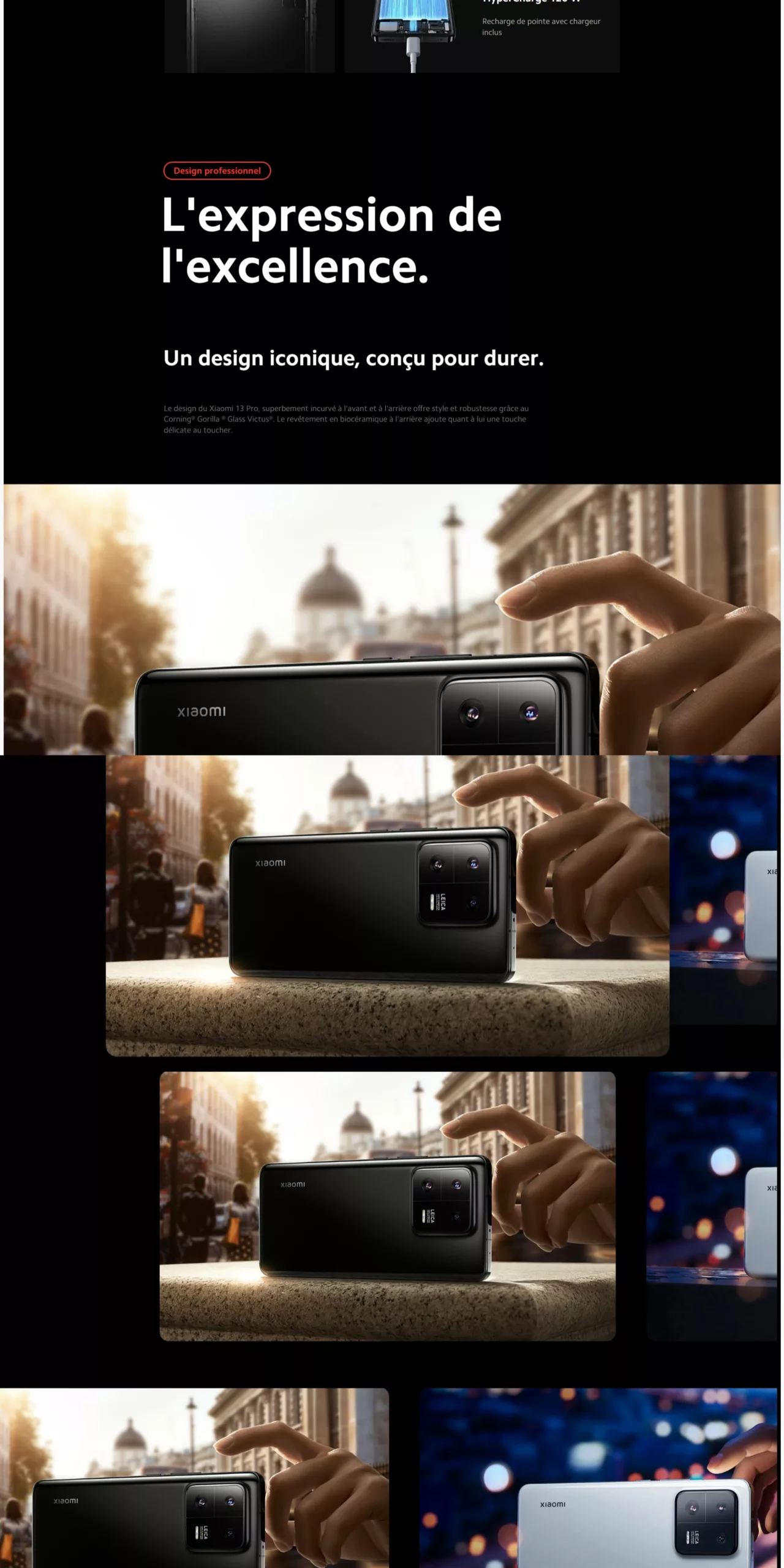 – Façade en verre (Gorilla Glass Victus), dos en céramique ou dos en polymère de silicone, cadre en aluminium
