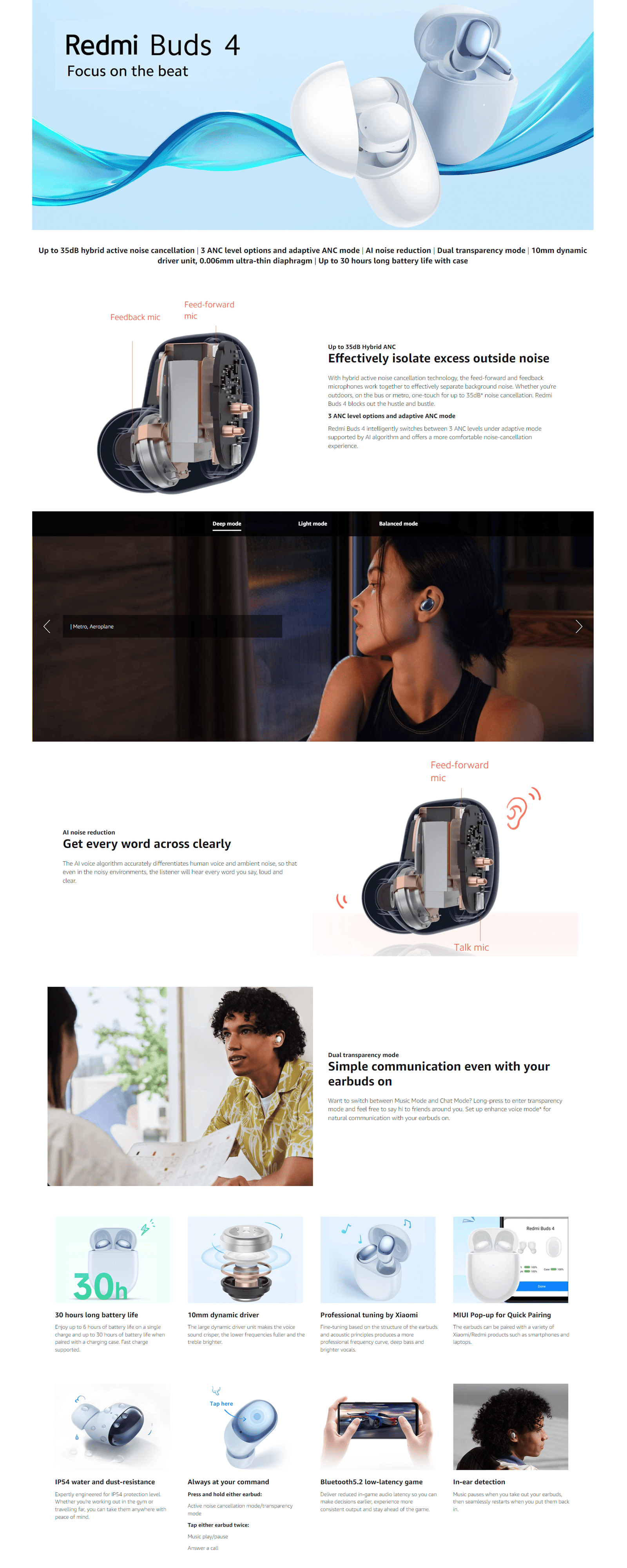 – Jusqu’à 35 dB Hybrid ANC : La suppression active du bruit avec 3 modes peut réduire jusqu’à 35 dB du bruit environnant. IPX6 étanche peut empêcher les dommages causés par les éclaboussures causées par la sueur et les gouttes de pluie.